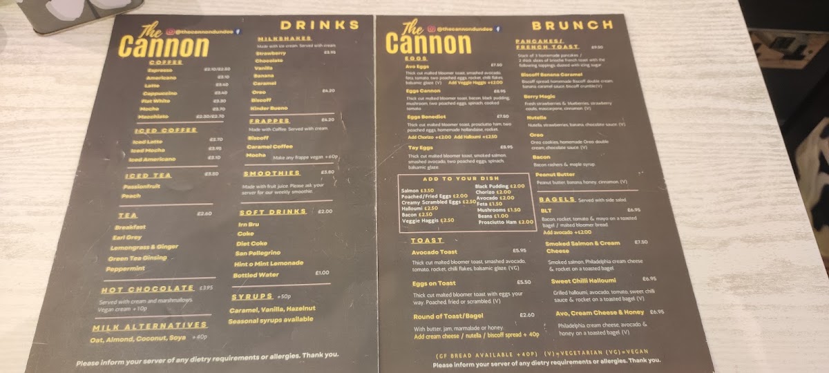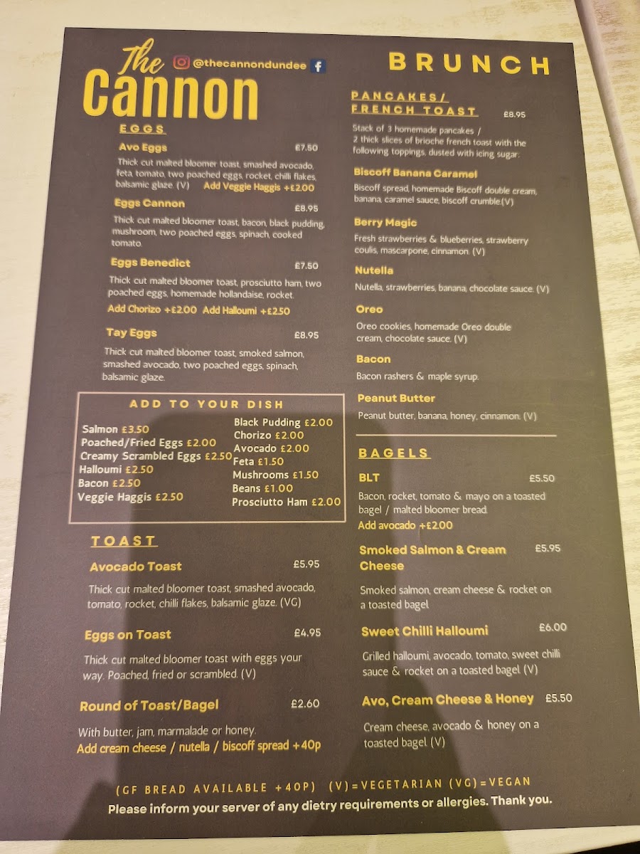 Welcome to The Cannon, a delightful cafe nestled at 11 Union St, Dundee. This haven boasts a menu brimming with culinary creativity and comfort. Start your day with their expertly crafted coffees, including rich Espresso, smooth Americano, or velvety Flat White.